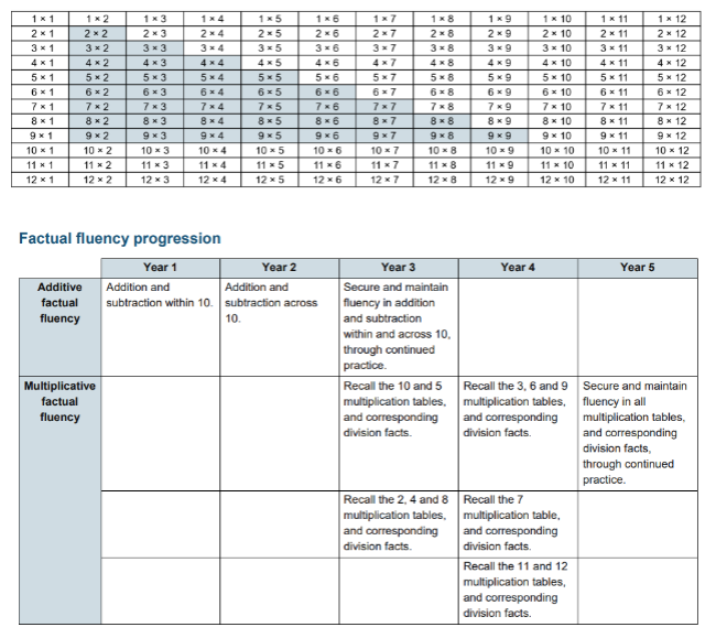 Multiplication and division facts: The full set of multiplication calculations that pupils need to be able to solve by automatic recall are shown in the table below. Pupils must also have automatic recall of the corresponding division facts. Pupils must be fluent in these facts by the end of year 4, and this is assessed in the multiplication tables check. Pupils should continue with regular practice through year 5 to secure and maintain fluency. The 36 most important facts are highlighted in the table. Fluency in these facts should be prioritised because, when coupled with an understanding of commutativity and fluency in the formal written method for multiplication, they enable pupils to multiply any pair of numbers.We use daily 2-minute Mastering Multiplication practise booklets to develop fluency across Years 3, 4 and 5 (if needed). Children learn the multiplication tables in the families, making connections between the multiplication tables in each family enables children to develop automatic recall more easily, and provide a deeper understanding of multiplication and division.Once children are fluent and confident, they can earn their SMILE badge!