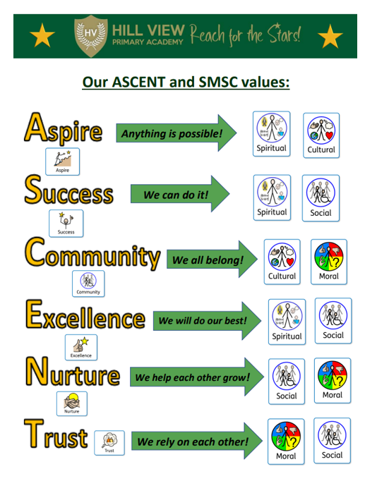 Our school values of Aspire, Community, Excellence, Nurture and Trust are closely linked to the SMSC development of the pupils at Hill View and the children strive to exhibit these. Children displaying all of these values exceptionally are rewarded with an ASCENT award badge which they can wear with pride throughout their whole time at Hill View.