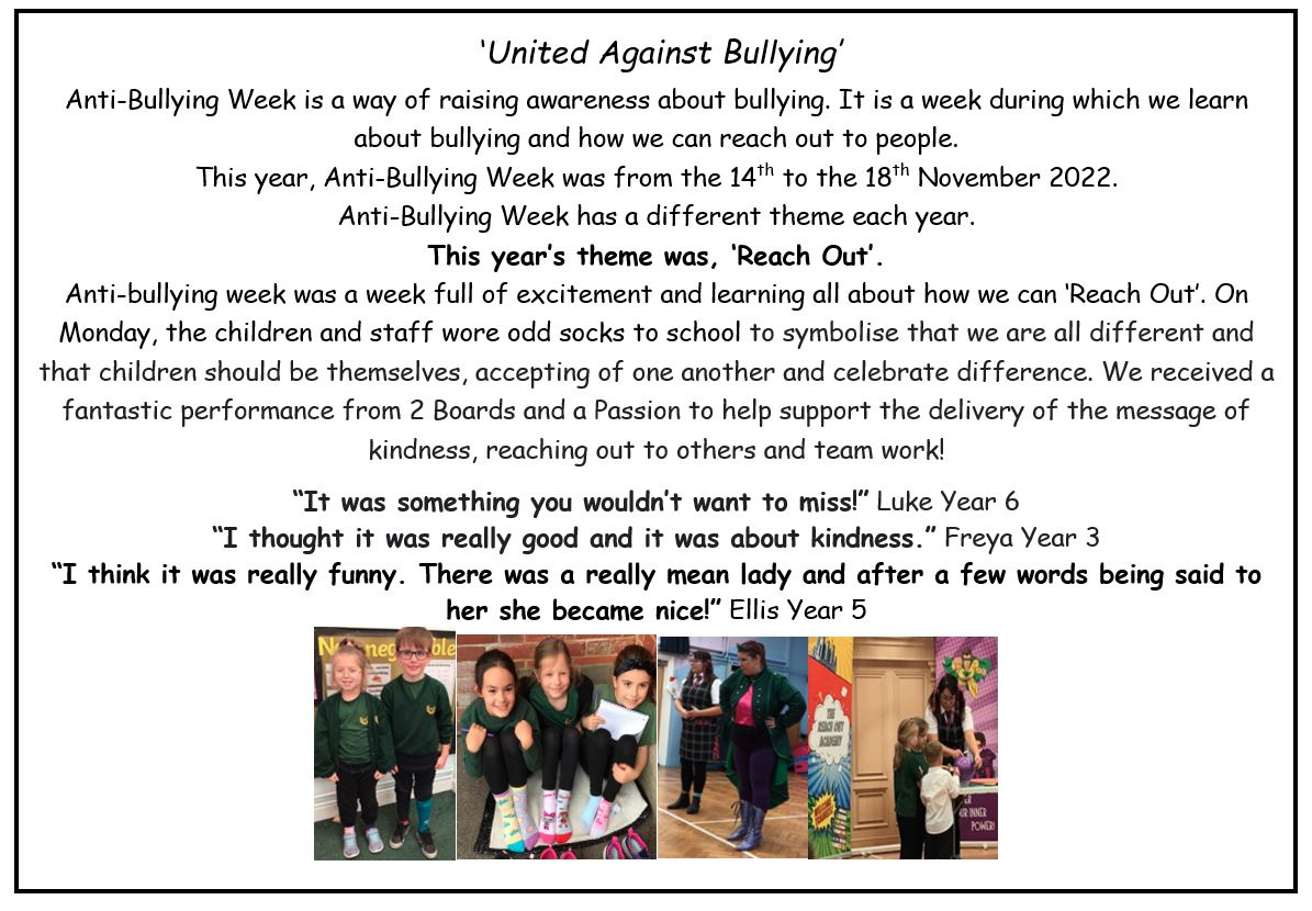 During our whole school anti-bullying week, each child was asked to create a heart petal for our ‘Tree of kindness’. The children also watched a performance by Two Boards and a passion focusing on the themes ‘Sticks and Stones’ which linked to the theme of ‘One Kind Word’. Each class created a class promise focused on the themes of kindness, tolerance and respect to ensure bullying does not take place in any class